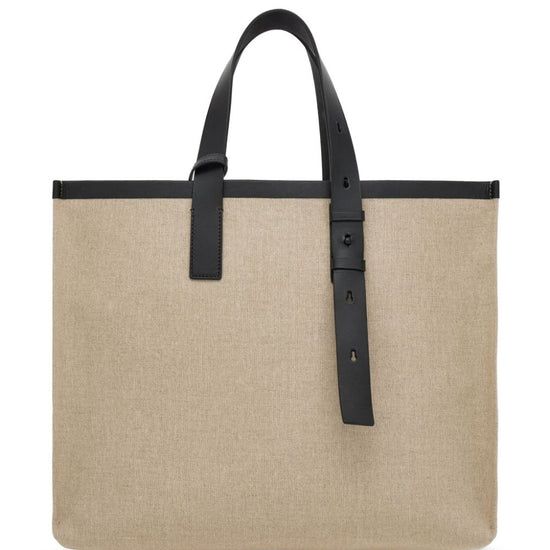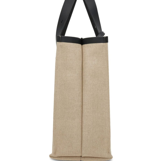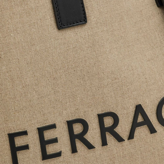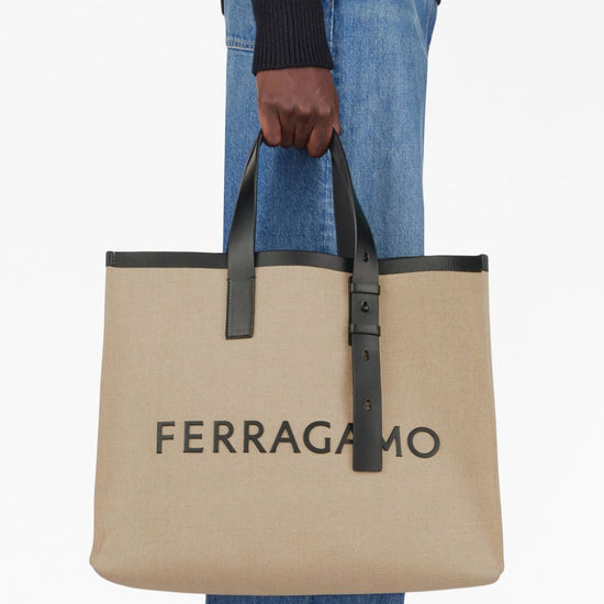 Logo-embossed leather tote bag from ferragamo featuring sand beige, black, calf leather, canvas, embossed logo to the front, leather trim, removable pouch, open top, two adjustable top handles and main compartment. logo canvas tote size and fit - width 16,93 in / 43 cm