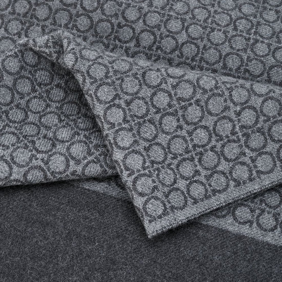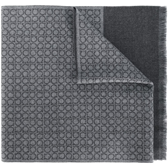 Ash grey wool gancini print contrasting panel detail fringed edge rectangle shape wraparound style gancini wool scarf size and fit - width: 34.0 centimetres. length: 180.0 centimetres.