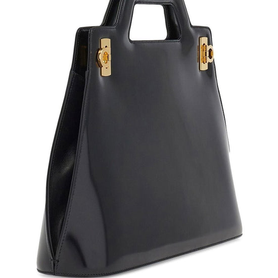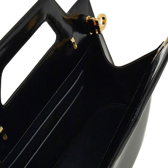 Intense black, veal leather, swivel closure gancini, handle with design cut out, unique compartment and gold -colored details. wanda leather top-hndle bag size and fit - width 14,17 in / 36 cm