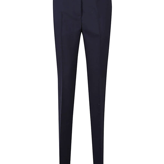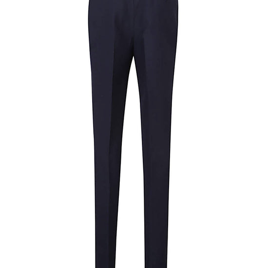 Blue trousers, closing with asymmetrical tab, pocket with fillet on the back, ironed fold, straight leg, two pockets. wool trousers size and fit - this piece fits true to size. we recommend you get your regular size. model is 1,75m / 5ft 8in wearing size 40 (it)