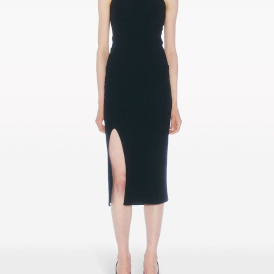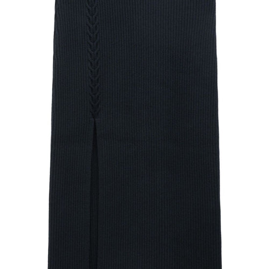 Black organic cotton ribbed knit front slit elasticated waistband mid-length straight hem this item is made from at least 50% organic materials. learn more about what makes a product conscious on our conscious criteria page cable knit asymmetrical skirt size and fit - this piece fits true to size. we recommend you get your regular size. model is 1,75m / 5ft 8in wearing size s