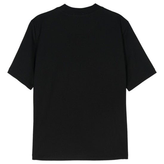 Black organic cotton jersey texture mock neck short sleeves straight hem cotton t-shirt size and fit - this piece fits true to size. we recommend you get your regular size. model is 1,75m / 5ft 8in wearing size s