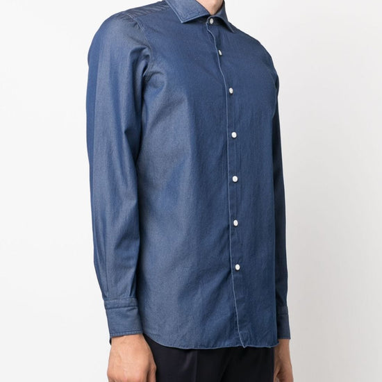 Navy blue cotton spread collar front button fastening long sleeves buttoned cuffs rear curved hem napoli cotton shirt size and fit - this piece fits true to size. we recommend you get your regular size. model is 1,84m / 6ft 1in wearing size 39 (collar cm)