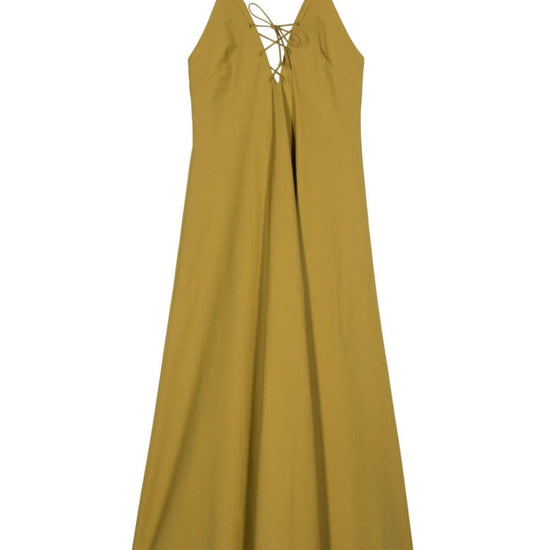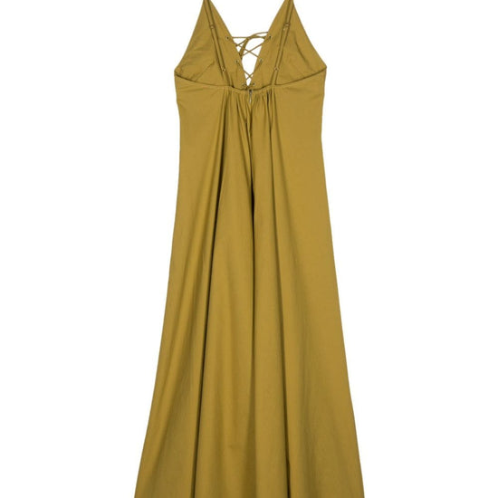 Khaki cotton poplin texture v-neck sleeveless adjustable spaghetti straps low back flared hem front tie fastening concealed rear zip fastening lungo, aperto, jacquard cotton long dress size and fit - this piece fits true to size. we recommend you get your regular size. model is 1,75m / 5ft 8in wearing size 1 (num)