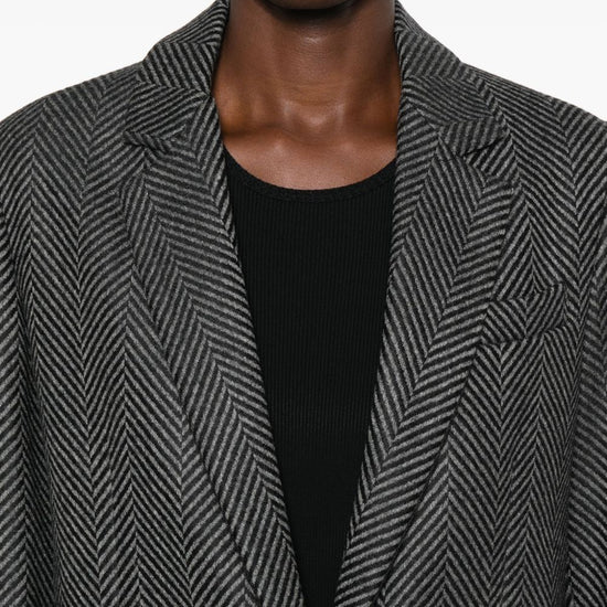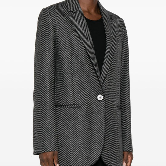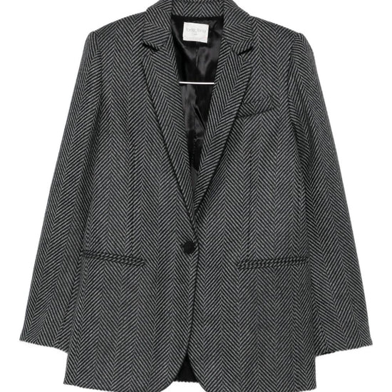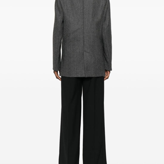 Black front button fastening two front welt pockets notched lapels herringbone pattern wool single-breasted jacket
