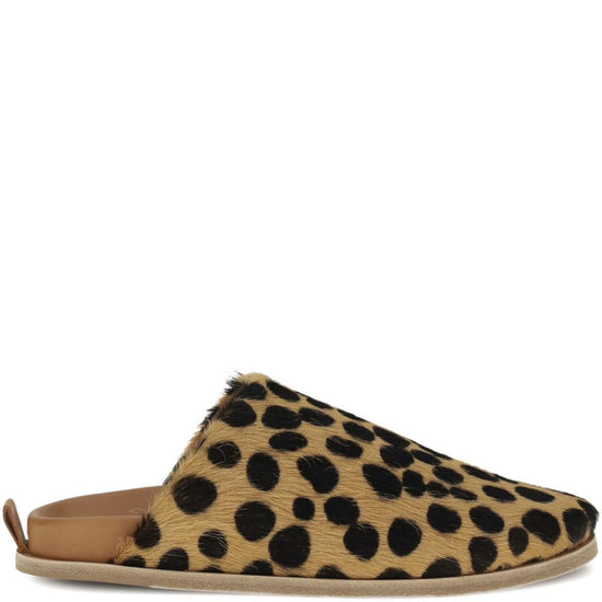 Light brown pony hair spotted pattern backless design flat sole slip-on style printed slippers