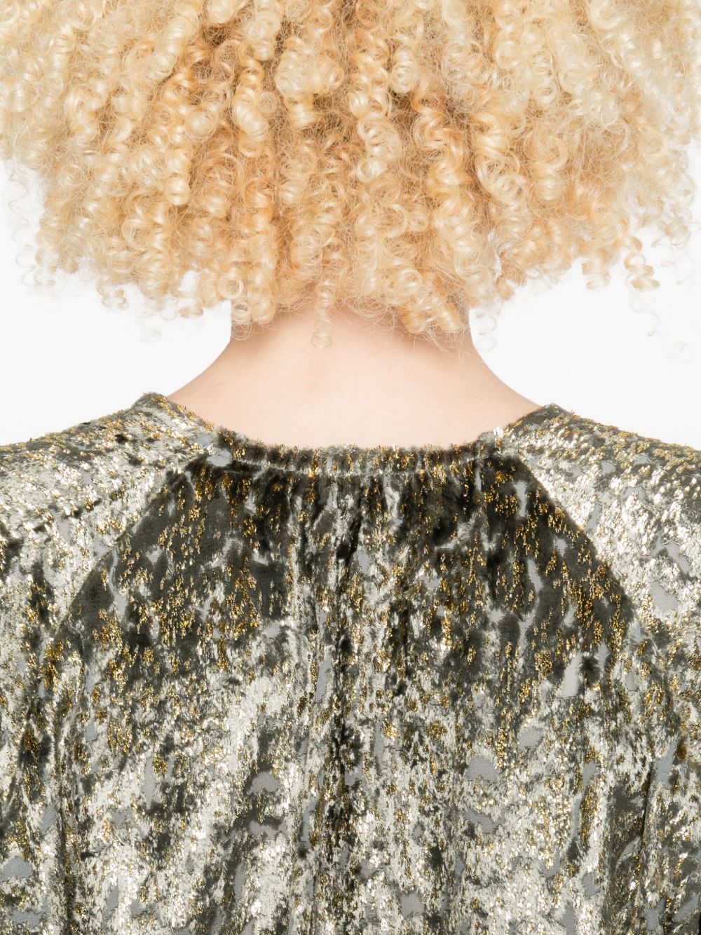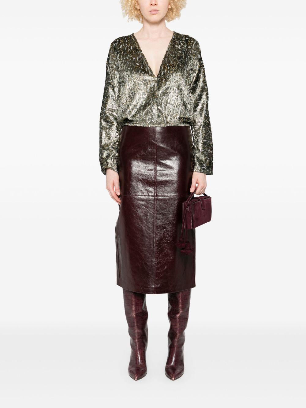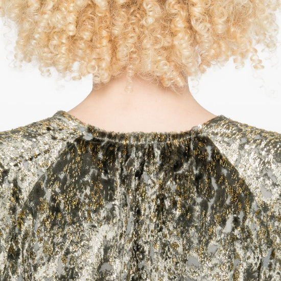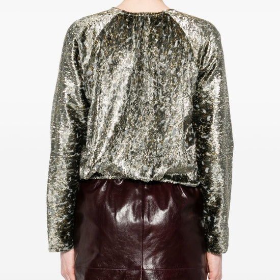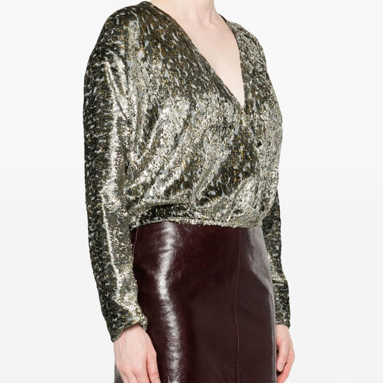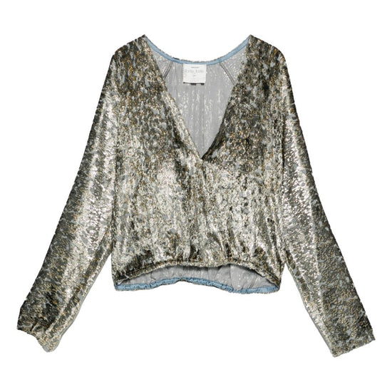 Silver metallic effect v-neck long sleeves crossed front elasticated hem v-necked top
