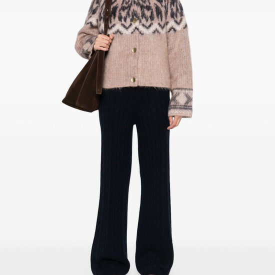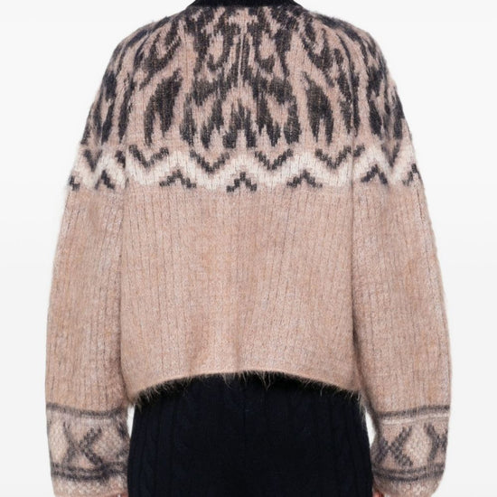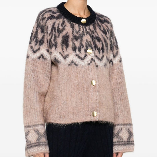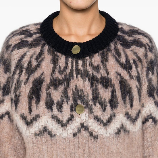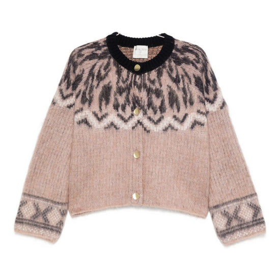 Pink patterned round neck front button fastening long sleeves ribbed trims wool jacquard cardigan
