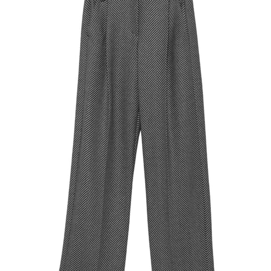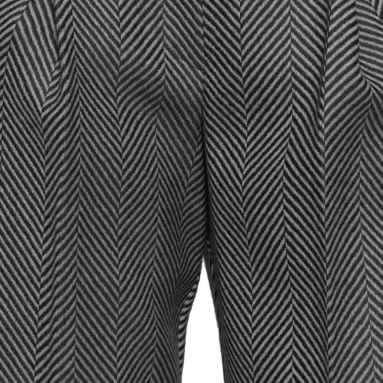 Black and grey herringbone pattern belt loops pleats back pocket wool trousers