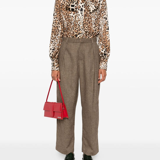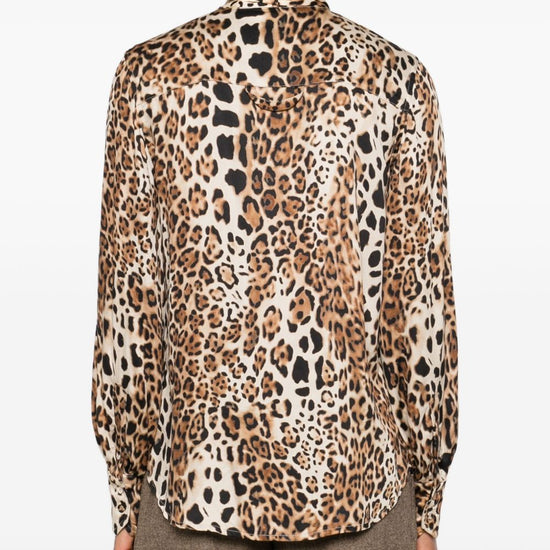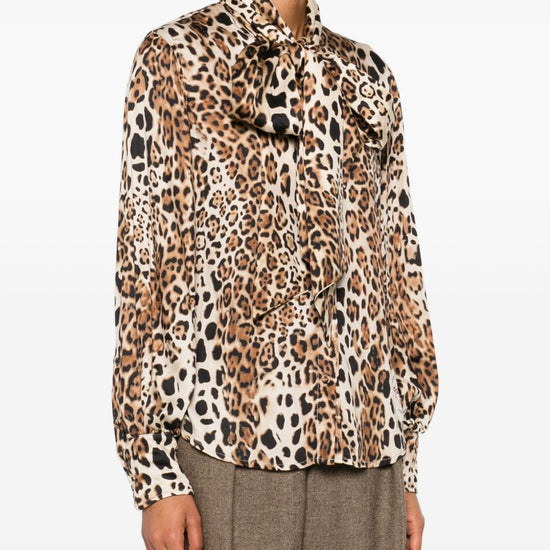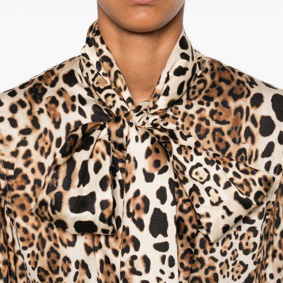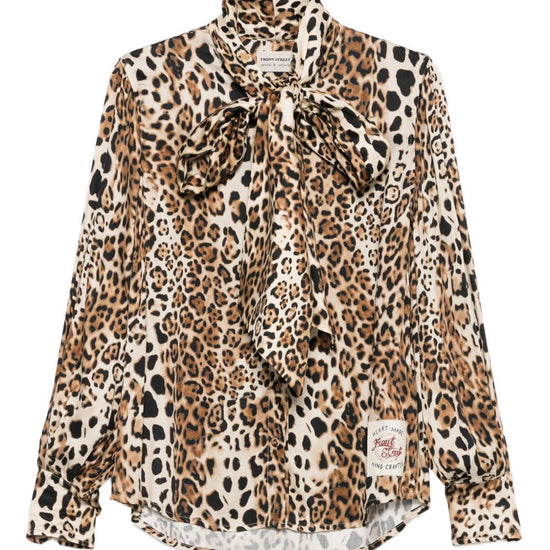 Brown leopard print bow tie neck long sleeves button fastening bow-tie printed blouse