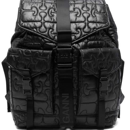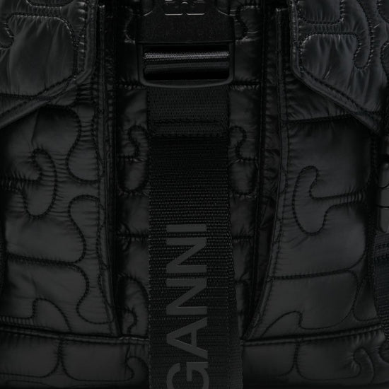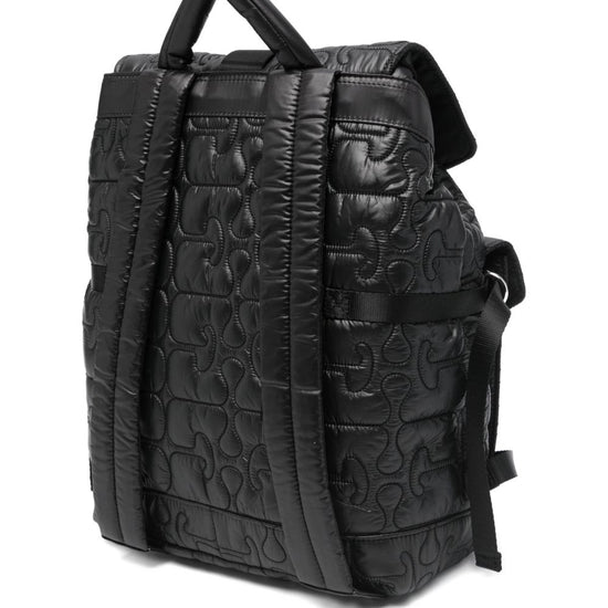 Black quilted top handle adjustable shoulder straps two front flap pockets drawstring fastening quilted nylon backpack