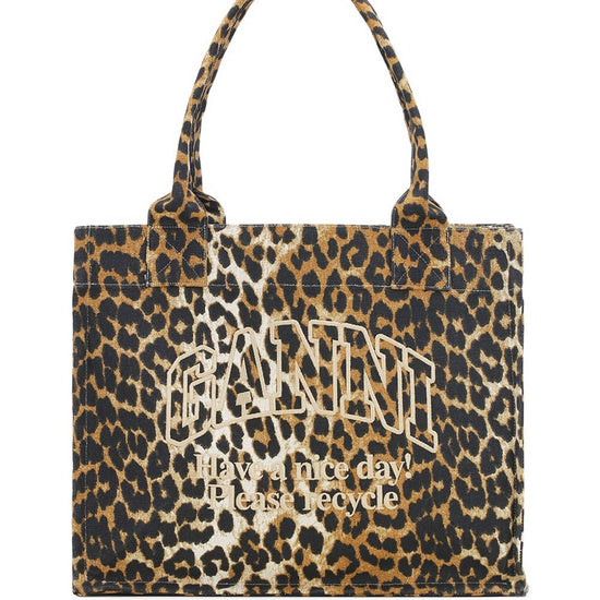 Beige logo lettering dual top handles contrasting leopard print spacious interior open top design large tote bag size and fit - depth 17 cm. height 31 cm. width 40 cm.