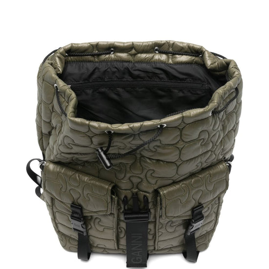 Green quilted top handle buckle fastening two front pockets adjustable shoulder straps quilted nylon backpack size and fit - depth 13 cm. height 38 cm. width 35 cm.