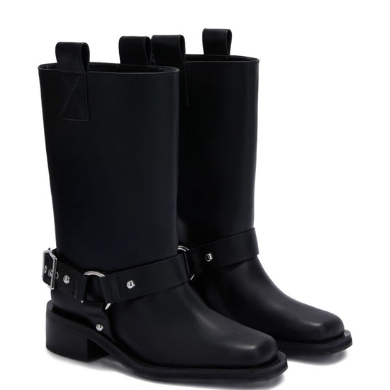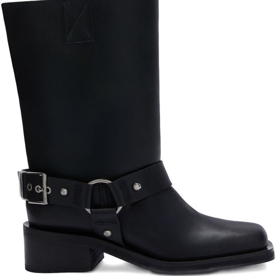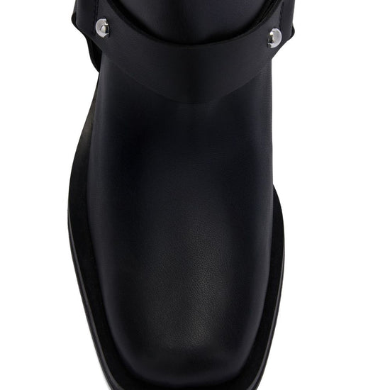 Black harness detail silver-tone hardware pull-tab at the opening block heel recycled leather biker boots