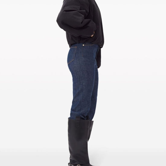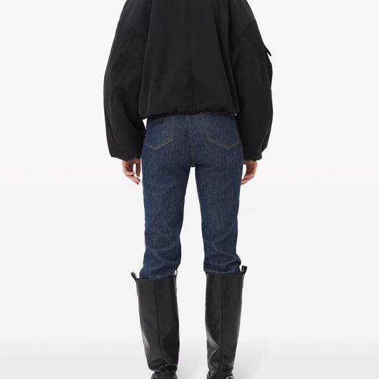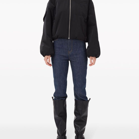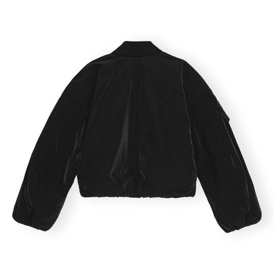 Black recycled polyester band collar drop shoulder long sleeves elasticated cuffs front zip fastening sleeve flap pocket elasticated hem cropped chest welt pocket two side welt pockets this item is made from at least 50% recycled or upcycled materials. for recycled synthetic clothing products, we highly recommend using a microfibre-catching washing bag to ensure that no microplastics that can pollute water are released in the process. learn more about what makes a product conscious on our conscious criteria page overszied short bomber jacket