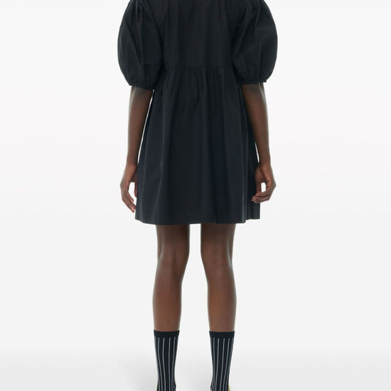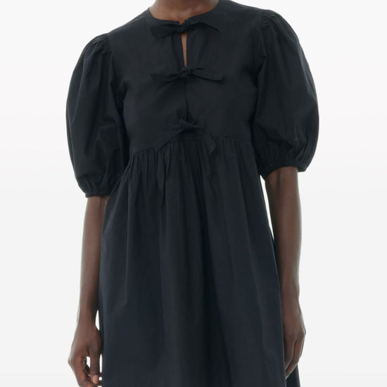 Black, organic cotton, poplin texture, front tie fastening, round neck, short puff sleeves, thigh-length. organic cotton mini dress