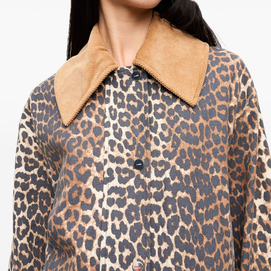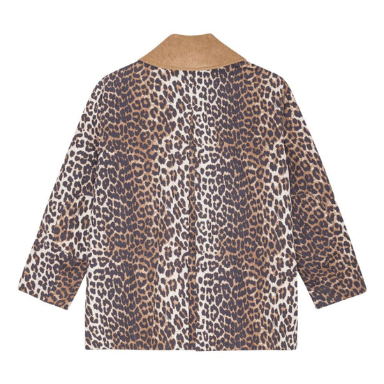 Brown, front button fastening, wide peak lapels, animal print. organic cotton jacket