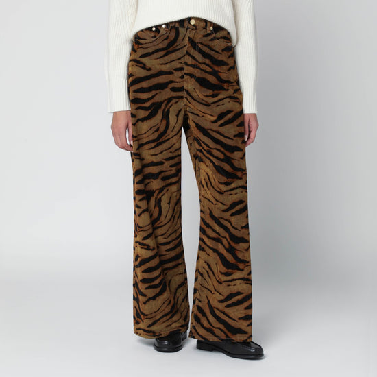 Ganni baggy jeans in khaki recycled cotton-blend denim with zebra print, featuring front zip and button closure, belt loops, five classic pockets, and back logo patch. size and fit - model wears size 26 model measurements: height: 178 cm chest: 83 cm waist: 63 cm hips: 91 cm