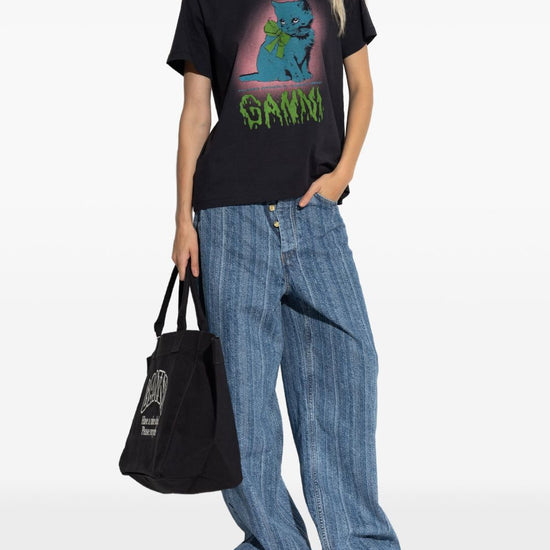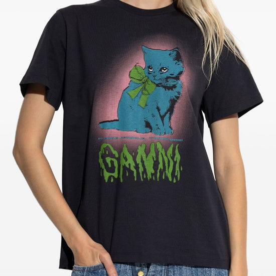 Dark grey kitten with bow graphic dripping text short sleeves crew neck neon kitty organic cotton t-shirt
