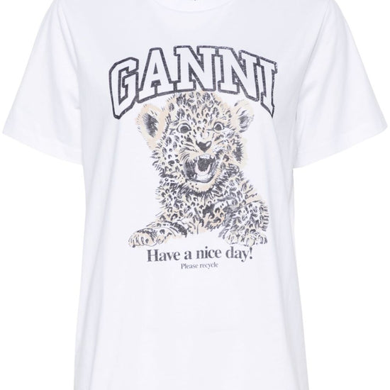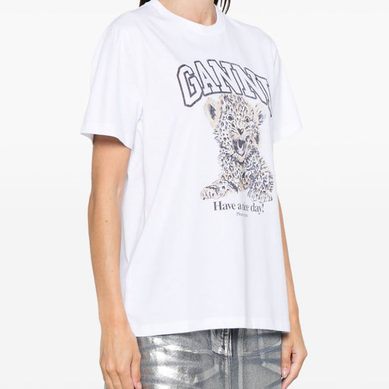 White/multicolour organic cotton jersey texture leopard print ribbed crew neck short sleeves logo print to the front straight hem conscious: leopard organic cotton t-shirt