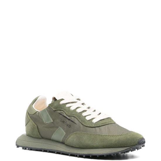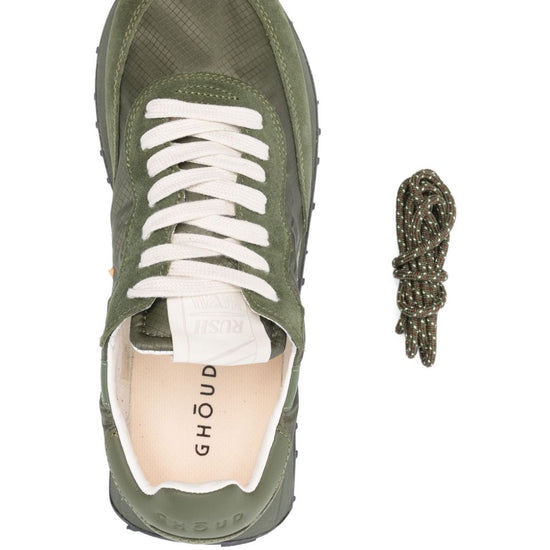 Khaki green/multicolour leather/suede/fabric contrasting panel detail front lace-up fastening logo-embossed tongue logo print to the side branded heel counter ridged rubber sole rush one low sneakers