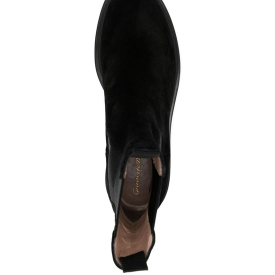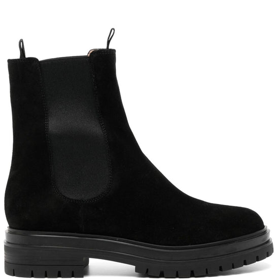 Brown suede tonal stitching elasticated side panels double pull-tab at the opening round toe slip-on style branded leather insole ridged rubber sole ankle-length chester suede leather boots