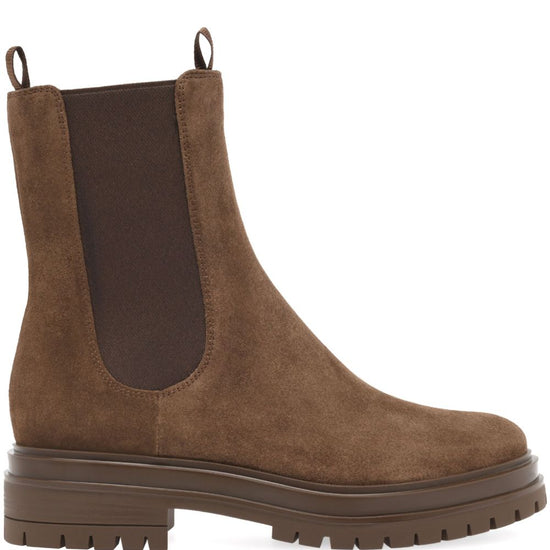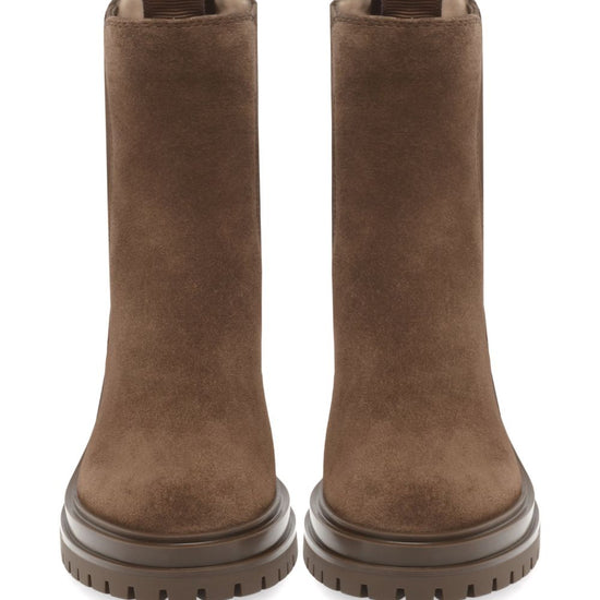 Brown suede tonal stitching elasticated side panels double pull-tab at the opening round toe slip-on style branded leather insole ridged rubber sole ankle-length chester suede leather boots