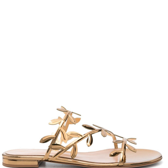 Gold-tone calf leather patent finish leaf motif almond open toe branded leather insole flat leather sole slip-on style flavia flat sandals size and fit - heel: 1.5 centimetres