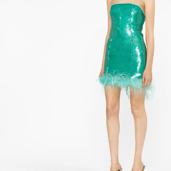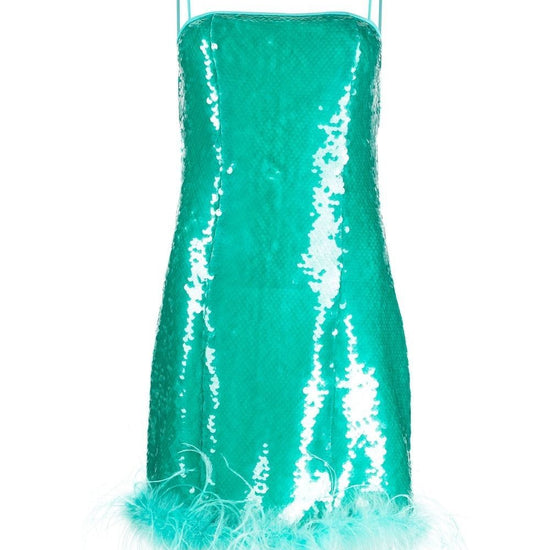 Sequinned feather-embellished minidress from giuseppe di morabito featuring aqua blue, sequin embellishment, spaghetti straps, square neck, sleeveless, feather-trim detailing and concealed rear zip fastening. feather detail short dress size and fit - this piece fits true to size. we recommend you get your regular size. model is 1,75m / 5ft 8in wearing size 40 (it)