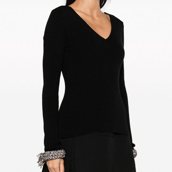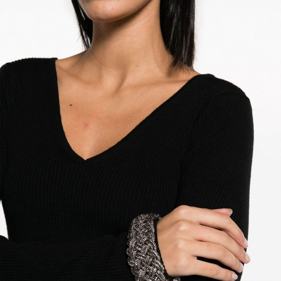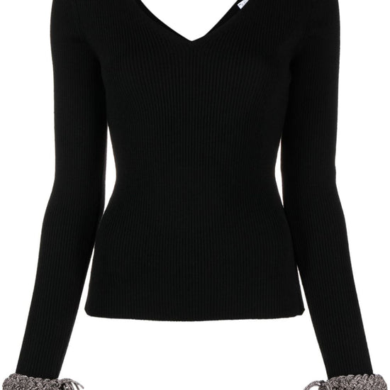 Braided-cuffs ribbed-knit top from giuseppe di morabito featuring black, merino wool blend, ribbed knit, v-neck, v-back, long sleeves, contrasting cuffs and straight hem. dettaglio cristalli + cut-out crystal embellished wool top size and fit - this piece fits true to size. we recommend you get your regular size. model is 1,75m / 5ft 8in wearing size 40 (it)