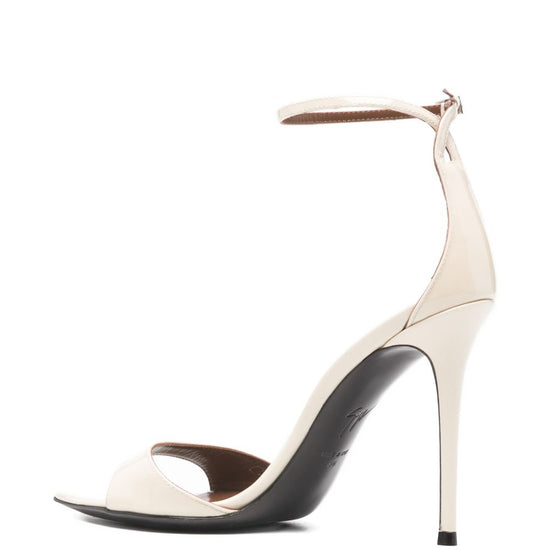Off-white silk upper stiletto heel ankle strap buckle fastening pointed toe intriigo leather heel sandals
