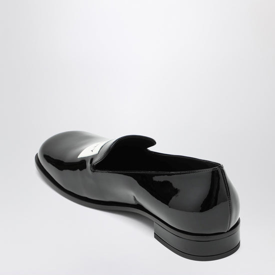 Givenchy patent leather loafers in black, featuring a givenchy paris label stitched on the upper, square toe, and leather sole.