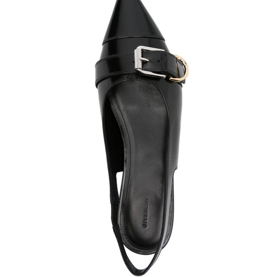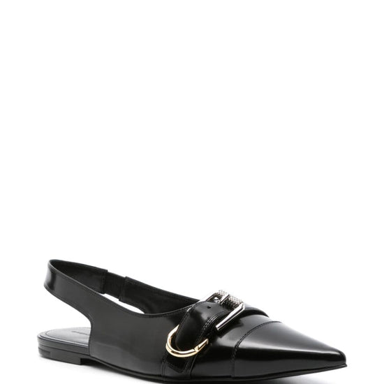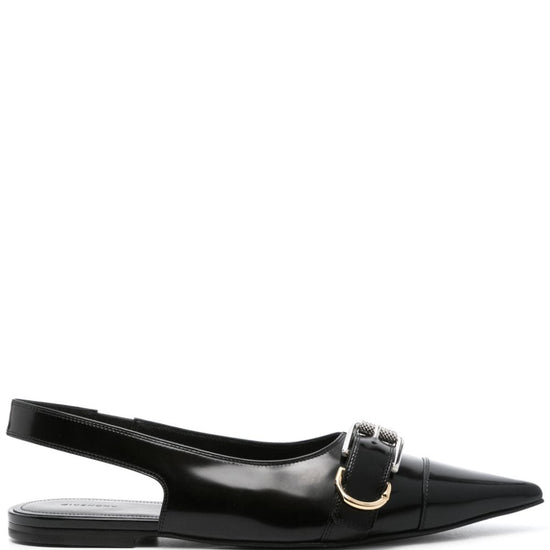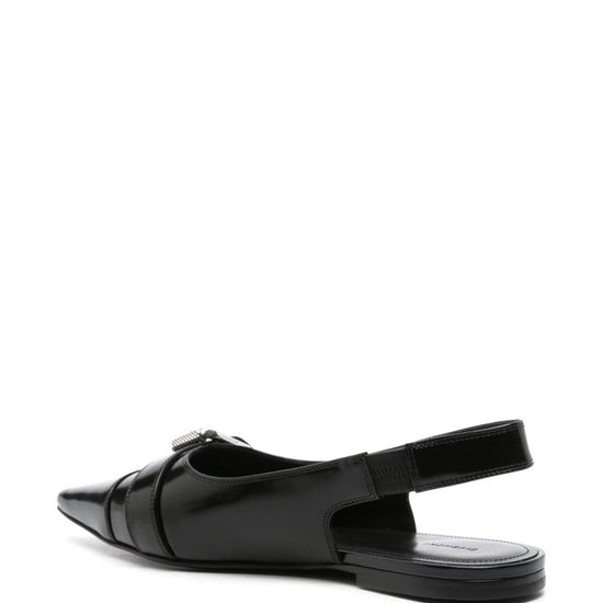 Black calf leather patent finish pointed toe decorative buckle detail elasticated slingback strap branded leather footbed leather and rubber sole this piece comes complete with a protective dust bag. voyou leather slingback flats size and fit - heel 0,4 in / 1 cm
