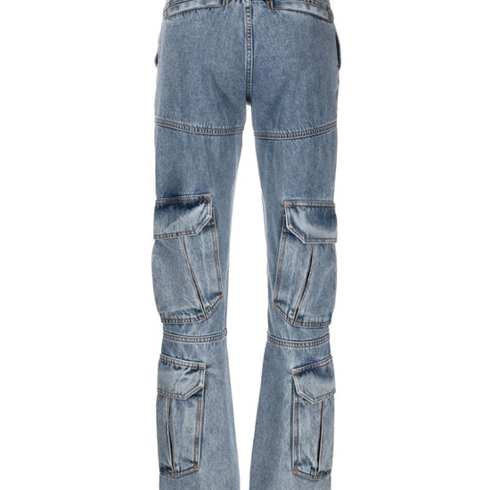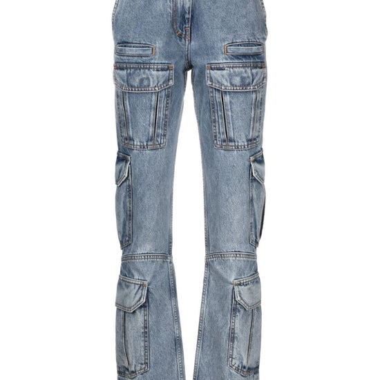 Light blue cotton denim panelled design silver-tone logo plaque belt loops concealed front fastening bootcut two side slit pockets two front welt pockets multiple cargo pockets two rear welt pockets straight hem cargo cargo denim cotton jeans size and fit - this piece fits true to size. we recommend you get your regular size. model is 1,75m / 5ft 8in wearing size 27 (waist cm)