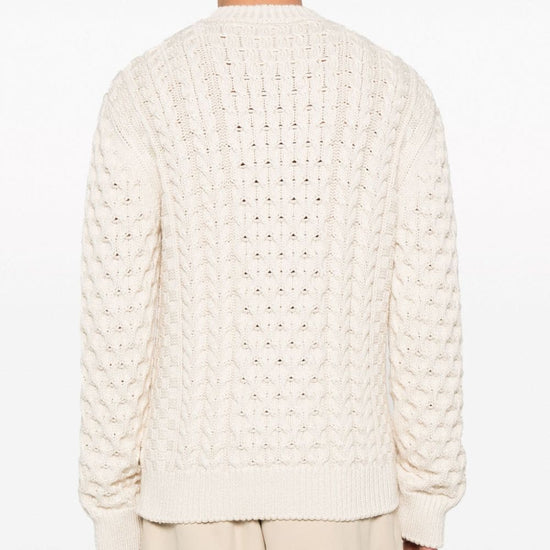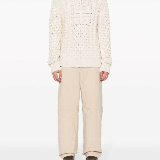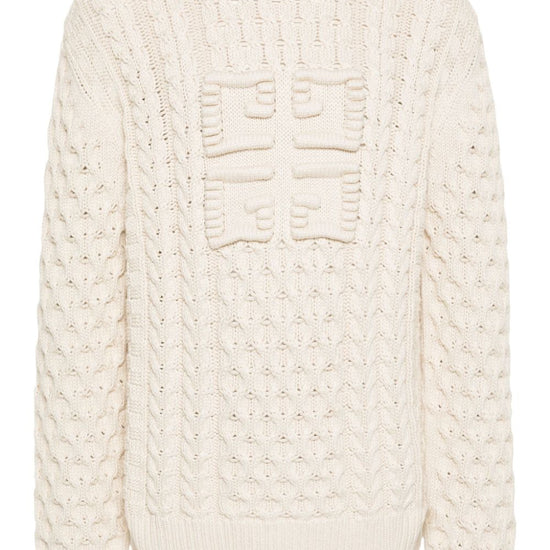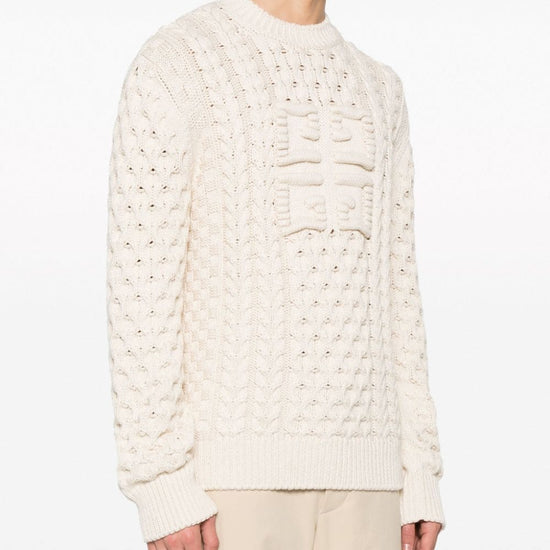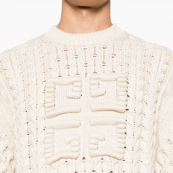 Ecru cotton blend chunky cable knit crew neck long sleeves ribbed cuffs and hem signature 4g motif straight hem logo cotton crewneck sweater size and fit - this piece fits true to size. we recommend you get your regular size. model is 1,84m / 6ft 1in wearing size m