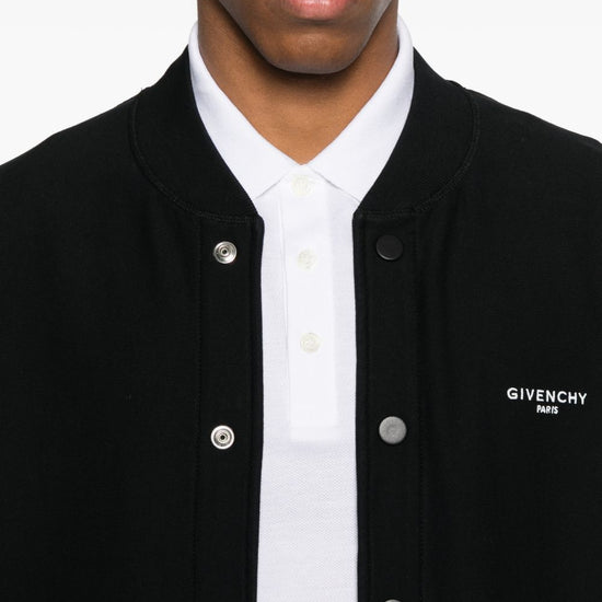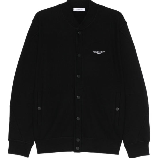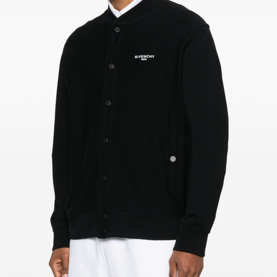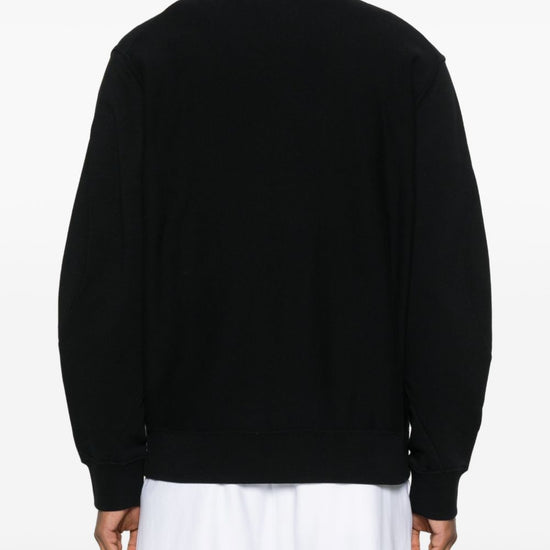 Black crew neck button fastening side welt pockets logo lettering cotton cardigan