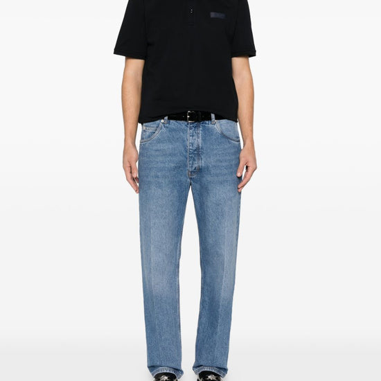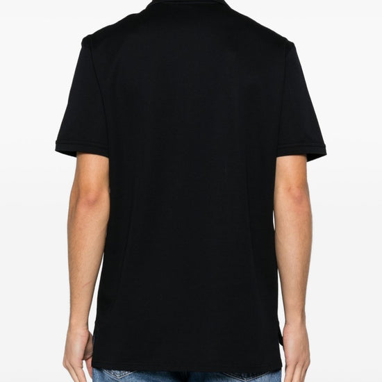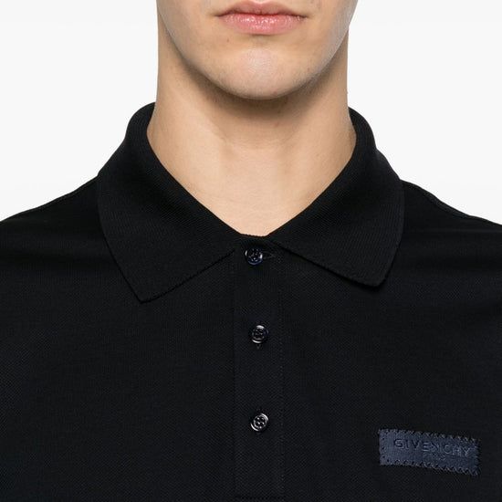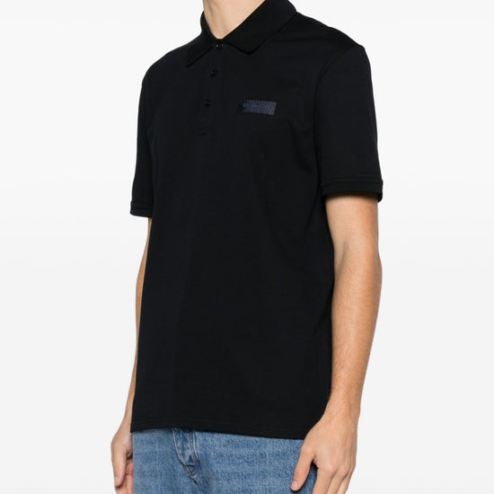 Navy blue logo patch button fastening short sleeves side slits cotton polo shirt