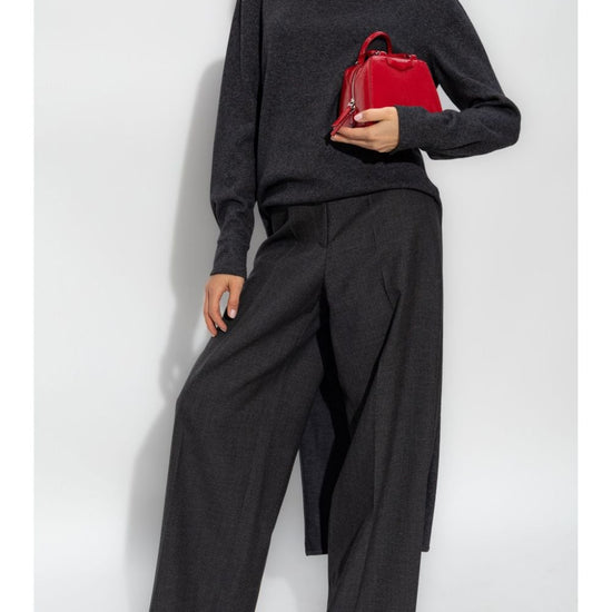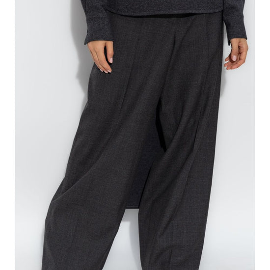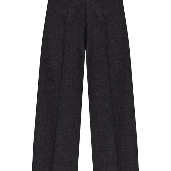 Grey virgin wool hook and zip fly fastening belt loops wide leg slip pockets to the sides two rear welt pockets wool trousers size and fit - this piece fits true to size. we recommend you get your regular size. model is 1,75m / 5ft 8in wearing size 36 (fr)