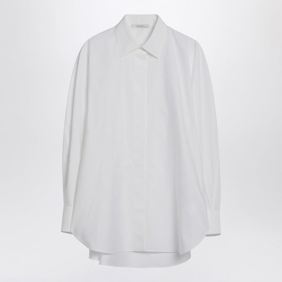 Wide givenchy white cotton shirt, characterized by hidden front buttoning, long sleeves with buttoned cuffs, and a curved hem that is longer at the back. size and fit - model wears size 36 fr model measurements: height: 179 cm chest: 83 cm waist: 61 cm hips: 88 cm