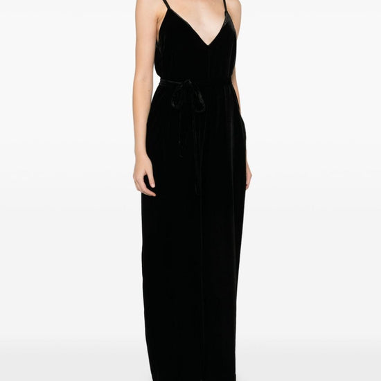 Black velvet v-neck concealed side zip fastening adjustable shoulder straps sleeveless tied waist two side slit pockets v-back wide leg velvet jumpsuit size and fit - this piece fits true to size. we recommend you get your regular size. model is 1,75m / 5ft 8in wearing size s