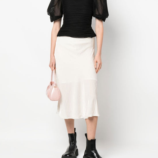 High-waisted silk-blend skirt from gold hawk featuring cream white, satin finish, pleat detailing, elasticated waistband, straight hem, partial lining and mid-length. s/m, inserti in pizzo, scollo v velvet long skirt size and fit - this piece fits true to size. we recommend you get your regular size. model is 1,75m / 5ft 8in wearing size s