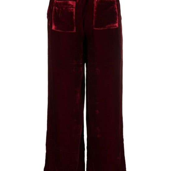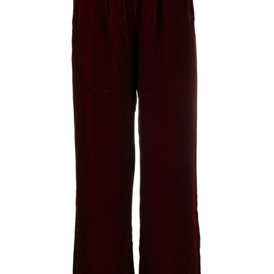 Ruby red velvet tonal stitching elasticated waistband two rear patch pockets straight leg velvet wide-leg trousers size and fit - this piece fits true to size. we recommend you get your regular size. model is 1,75m / 5ft 8in wearing size s