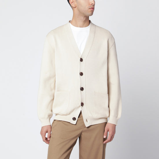 Cardigan by golden goose deluxe brand in beige cotton blend, featuring v-neckline, front button closure, long sleeves, two front patch pockets, ribbed trims, double star logo on the back, contrasting inside-out logo intarsia, and regular fit. size and fit - model wears size l model measurements: height: 189 cm chest: 104 cm waist: 78 cm hips: 95 cm