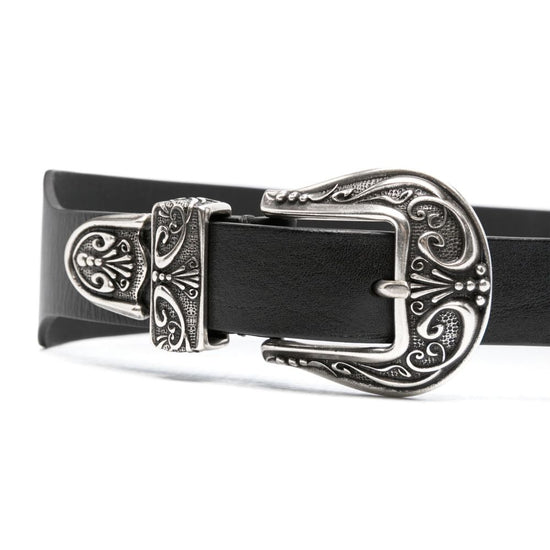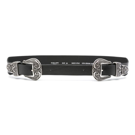 Black leather punched holes adjustable fit double buckle fastening double buckle leather belt size and fit - maximum length: 85.0 centimetres. minimum length: 80.0 centimetres. width: 5.0 centimetres.