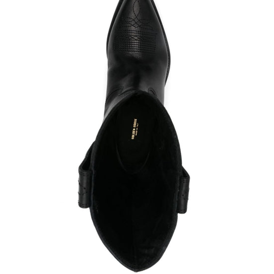 Black calf leather smooth grain decorative stitching double pull-tab at the opening low stacked heel pointed toe branded leather insole rubber sole wish star leather boots size and fit - heel 1,4 in / 3,5 cm