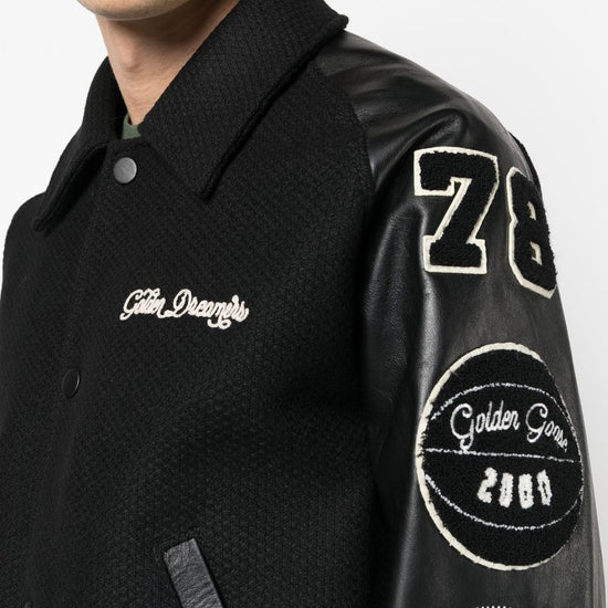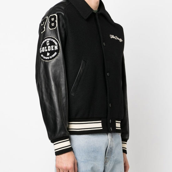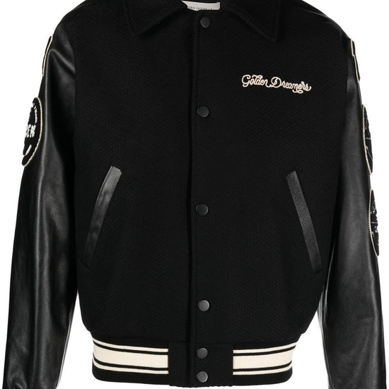 Black virgin wool calf leather embroidered motif patchwork detailing front press-stud fastening classic collar long sleeves wool and leather bomber jacket