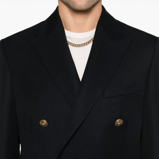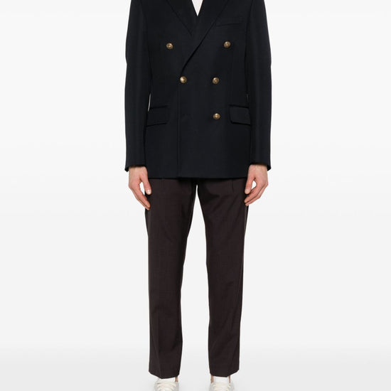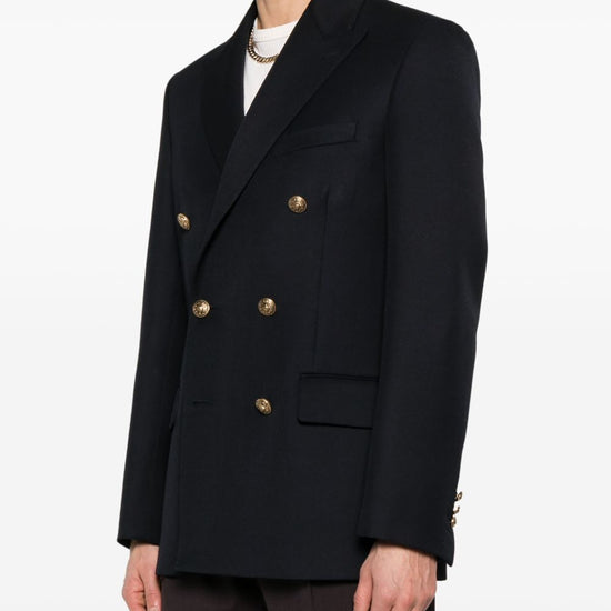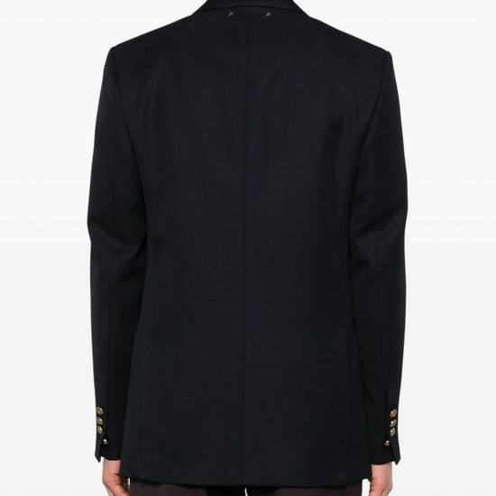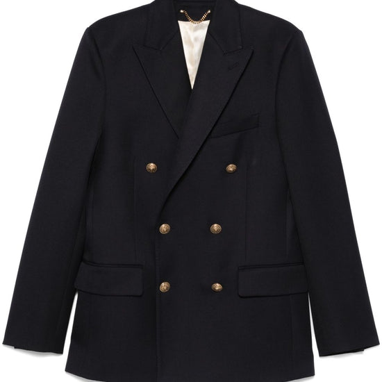 Dark blue double-breasted button fastening embossed gold-tone buttons logo patch at the sleeve peak lapels two front flap pockets chest welt pocket buttoned cuffs english rear vents wool double-breasted blazer jacket
