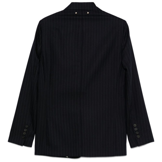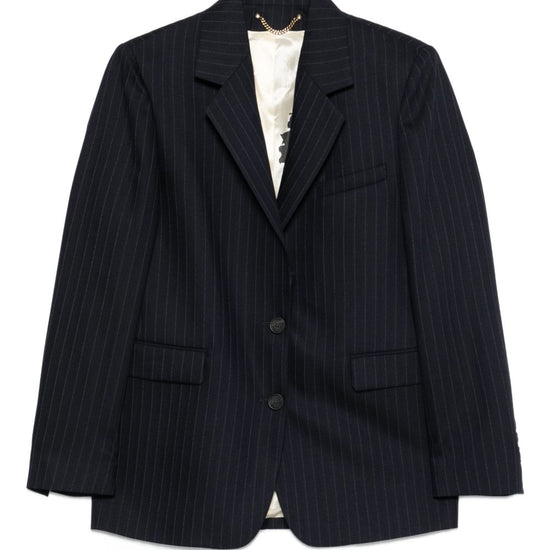 Navy blue pinstripe pattern single-breasted closure notched lapel long sleeves welt pockets wool oversized jacket