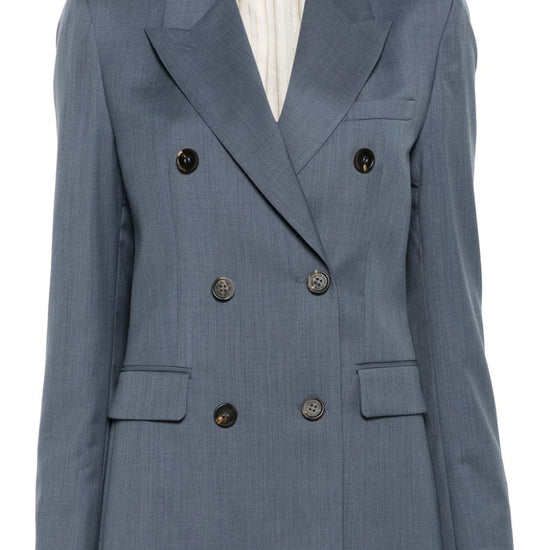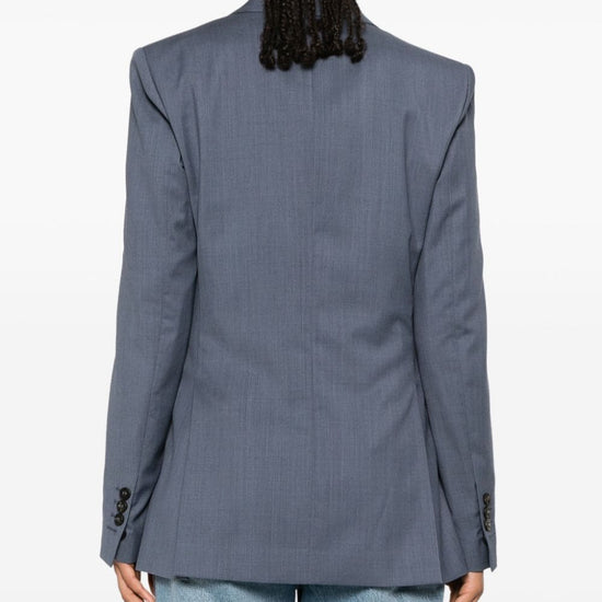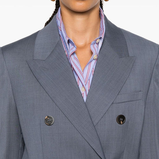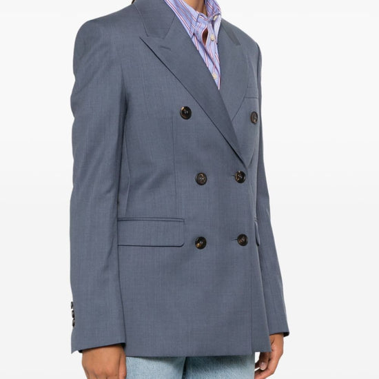 Blue-grey virgin wool textured finish double-breasted button fastening peak lapels shoulder pads long sleeves buttoned cuffs chest welt pocket two side flap pockets signature two-stars appliqué hardware english rear vents full lining straight hem journey double-breasted jacket size and fit - this piece fits true to size. we recommend you get your regular size. model is 1,75m / 5ft 8in wearing size 40 (it)