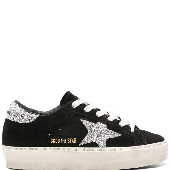 Black calf suede signature star patch to the sides logo-print tongue contrasting branded heel counter glitter detailing front lace-up fastening round toe branded leather insole french terry lining flat rubber sole hi star leather sneakers